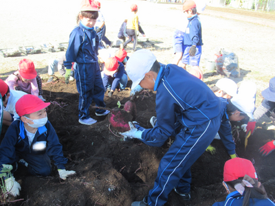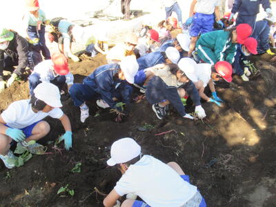 2年生は、畑で育ててきたさつまいもを収穫しました。掘り始めると、大きなさつまいもが見えてきました。