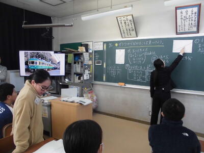 算数の研究授業では、6年児童の意見をうまくまとめながら授業を進めていました。研究授業や授業研究会では、本校教員も一緒に勉強させていただきました。