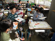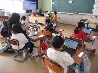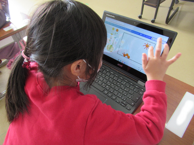 1年生、2年生は図工の時間でした。1年生はタブレットでスタンピングの作品の構図を考えていました。タブレットの操作も、とても上手になりました。