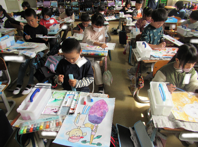 2年生は、絵の具で丁寧に色を塗っていました。パレットや筆の使い方がとても上手でした。