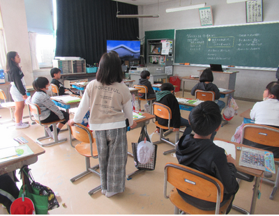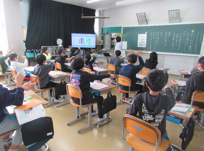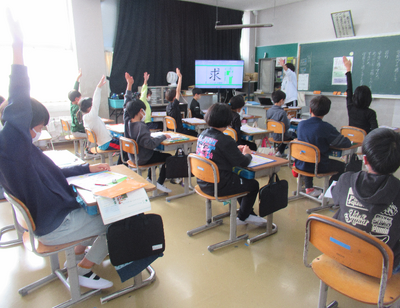 4年生の国語では、新出漢字の書き順を学習していました。手の挙げ方がとてもきれいでした。