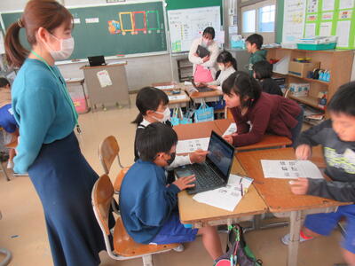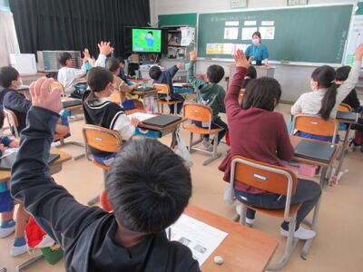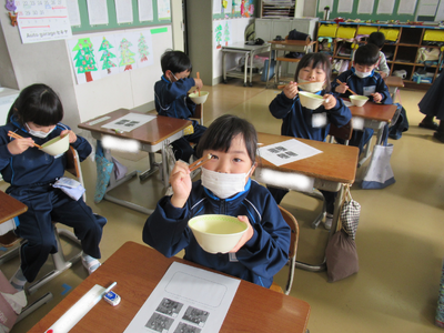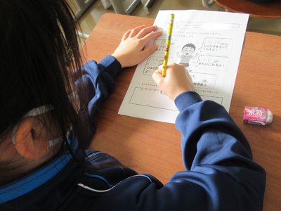 1年生は、アニメーションを観ながら正しい食事のマナーについて考えました。また、実際におはしを使いながら、正しい持ち方の練習を行いました。小さな豆をおはしで上手につまんで見せてくれました。