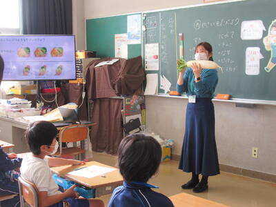 2年生は、野菜の栄養について学びました。野菜を食べると、体によいことがたくさんあることを知りました。また、野菜は、色の濃い野菜と色の薄い野菜があることや、調理した野菜を1日に片手に乗る量で3回分食べるとよいことも教えていただきました。