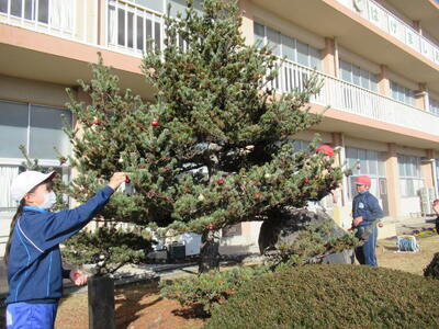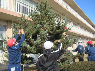 今日は、校舎前の木にクリスマスの飾り付けをしました。