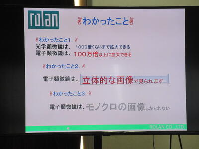 (株)ローラン様に御協力いただき、5・6年生が電子顕微鏡教室を行いました。肉眼では見ることのできない、ミクロの世界をみんなで楽しみました。
