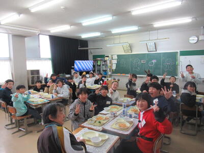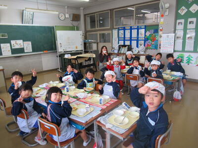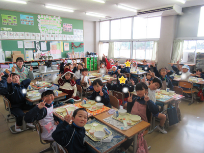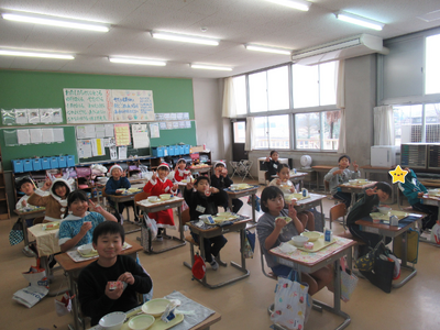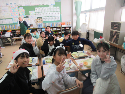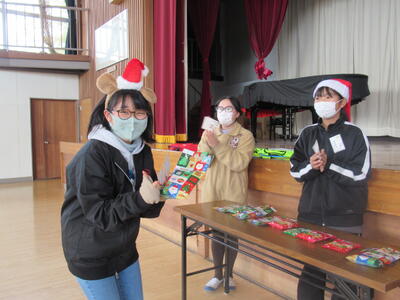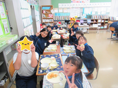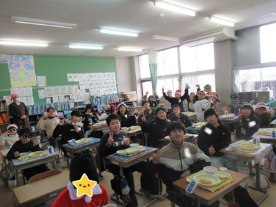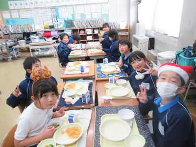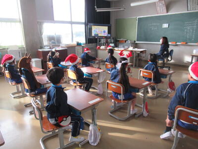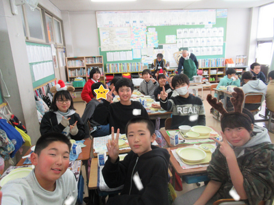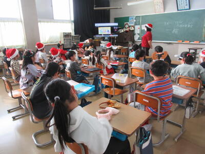 給食中に各教室をのぞくと、かわいいサンタやトナカイがたくさんいました。