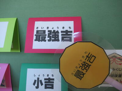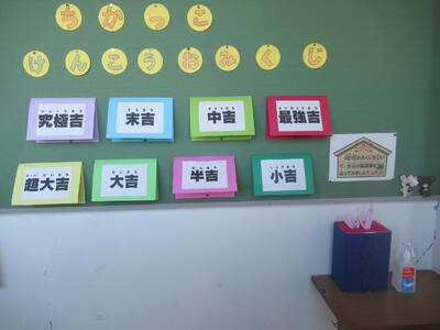 保健室前には、「ちかっこけんこうおみくじ」のコーナーがありました。おみくじを引いてみると、今日の運勢は「最強𠮷」でした。