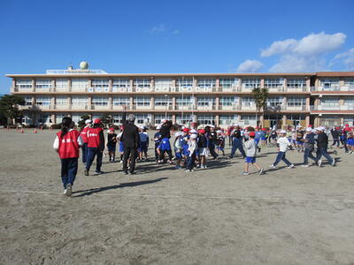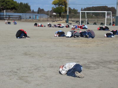 昼休みの中頃に避難訓練の放送が入りました。多くの児童が校庭で遊んでいましたが、放送を聞いて遊びをやめ、頭を守ってうずくまりました。数人の話し声と笑い声が聞こえたのが残念でしたが、多くの児童はしっかりと行動することができていました。