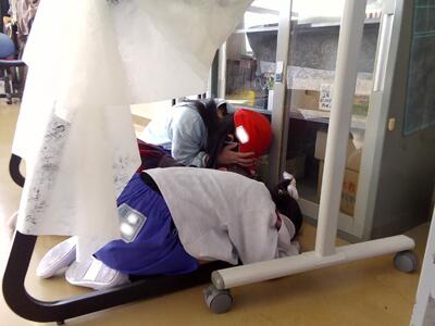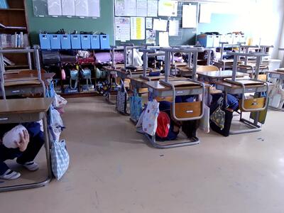 教室にいた児童も、机の下に入り、頭をしっかりと守ることができました。
