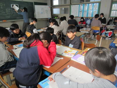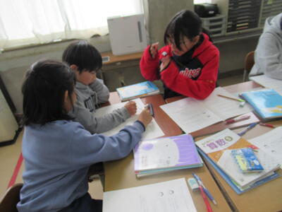 5年生は、先日行った学力確認テストの問題を解き直していました。文章量が多く、問題によっては難しいと感じた子も多かったようです。グループで教え合いながら頑張っていました。