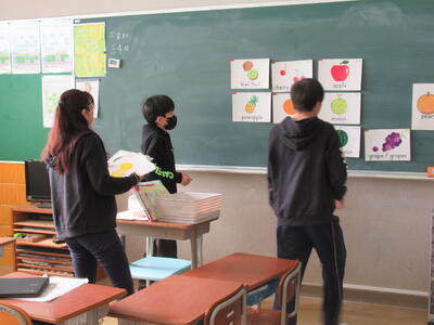 はばたき学級は、英語の授業でした。絵カードを使って、楽しみながらくだものの言い方の学習をしていました。正しくカードを選んだり発音したりすることができました。