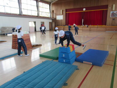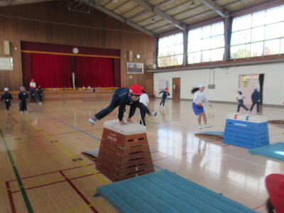 3年生は体育で跳び箱の練習をしていました。つき手の位置を遠くにするようアドバイスすると、跳び越すことができるようになった子がたくさんいました。