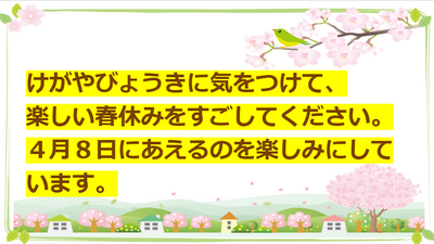 明日から春休みになります。14日間の春休みを楽しく有意義に過ごしてください。4月8日に、ちかっ子の皆さんと会えるのを楽しみにしています。