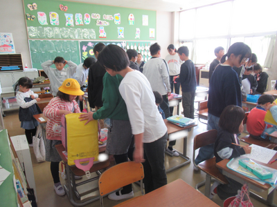 教室では、6年生が朝の準備を手伝ってくれていました。