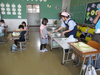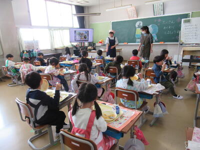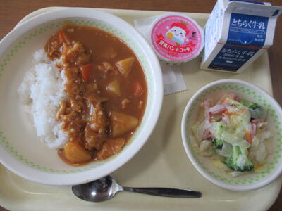 1年生は、小学校最初の給食です。今日のメニューは、子供たちの大好きなカレーライスです。カレーライスやサラダをおかわりする子もたくさんいました。